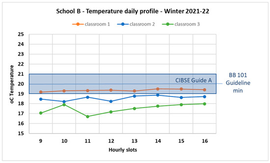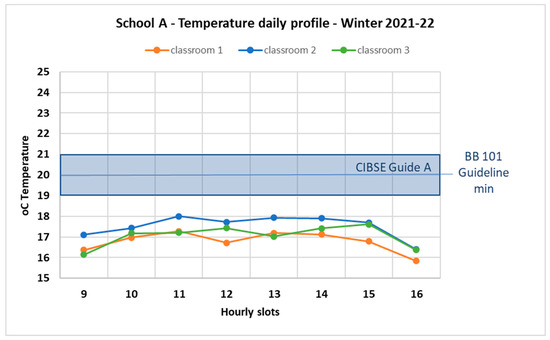 Figure 1 illustrates the daily profile of the temperatures in autumn for the three monitored classrooms in School A. The winter daily profile of the temperatures in School A is illustrated in