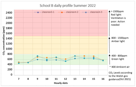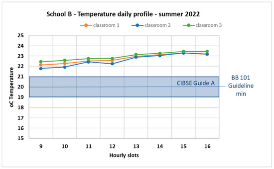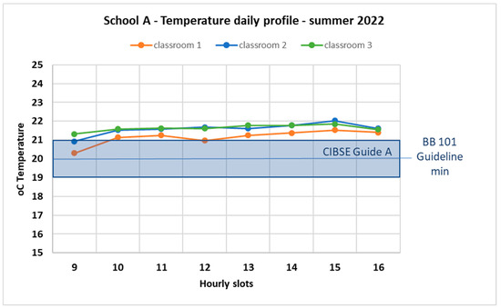 Figure 4 illustrates the temperature profile for three classrooms in School A for the hottest recorded period (Summer 2022). In Summer 2022, the minimum temperature recorded was 20 °C at 9 a.m. and the maximum temperature was 22 °C at 1 p.m.