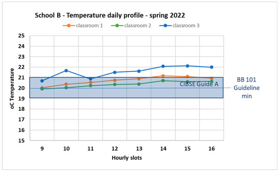 Figure 2. The temperature tends to be slightly colder than recommended by CIBSE Guide A guidance and Building Bulletin 101 (between 19–21 °C). In autumn, the temperature of classroom 3 is over 19 degrees most of the occupied hours. The temperature of classroom 1 tends to remain slightly colder than other monitored classrooms during occupied hours (between 17.5 °C and 18.5 °C). In winter, the average temperature of all classrooms in School A was recorded between 16 °C and 18 °C. The temperature daily profile in spring shows that the indoor temperatures of the monitored classrooms in School A are between 13 and 16 °C (colder than CIBSE Guide A recommendations) while the summer temperatures range is between 20 and 22 °C.