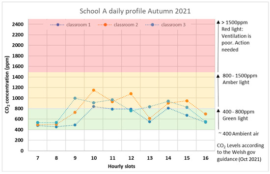 2 levels in the classrooms in School A corresponds to green and amber zone as per Welsh Government CO