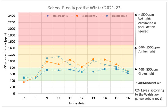 2 levels tend to remain below 1500 ppm (green and amber zones by Welsh Government guidance). In School B, the monitoring data suggest that CO