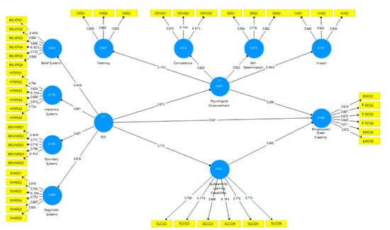 Following the literature, the independent variable (SCSs) is identified as a higher-order construct composed of four low-order constructs: belief systems (BLIEF), boundary systems (BOUND), interactive systems (INTER), and diagnostic systems (DIAG) [3]. This construct was measured using the scale developed by Wijethilake [3], consisting of 23 items. The dependent variable EGC is measured using the scale developed by Chen and Chang [31]. The first mediating variable, PE, is measured using the scale developed by Spreitzer [56], consisting of 12 items. The literature presents PE as a higher-order construct composed of meaning (ME), competence (COM), self-determination (SD), and impact (IM). The second mediating variable, SLC, is measured using the scale developed by Wijethilake and Upadhaya [46], consisting of six items. All four constructs in the study are measured using a five-point Likert-type scale ranging from “strongly disagree (1)” to “strongly agree (5)”.