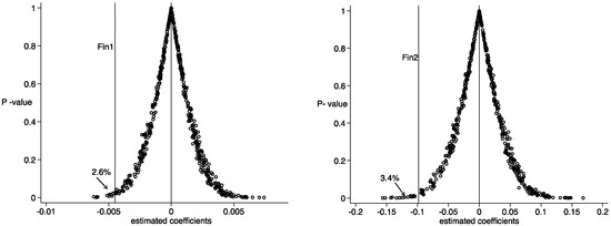 In the benchmark regression, this paper draws the conclusion that the opening of HSR can inhibit corporate financialization. It is undeniable that although the fixed effects of firms, industries, and years are controlled in the benchmark regression, they cannot eliminate the unobservable systematic differences that affect corporate financialization between the treated group and the control group, that is, the inhibition of the opening of HSR on corporate financialization is likely caused by those unobservable systematic differences, rather than the opening of HSR. In order to solve the above problem, referring to the practice of Ma et al. (2020) [3], we randomly selected a number of cities from the cities with HSR opened and randomly generated the opening time of HSR so as to form a randomly generated treatment group, then re-ran the regression in the model (1) based on the randomly generated dataset (HSR_Random), and repeated the regression 500 times by the Monte Carlo model, and finally mapped the distribution of the estimated coefficient. As shown in Figure 2, for both Fin1 and Fin2, the estimation coefficients of HSR_Random are all distributed around 0, while the real benchmark regression estimation coefficients are obviously out of the distribution of HSR_Random; there are only 2.6% and 3.4% probabilities that the estimated coefficients are in the distribution of HSR_Random. In short, the result passed the placebo test, implying that the inhibition of corporate financialization by the opening of HSR is not caused by accidental factors, and the conclusion still holds.