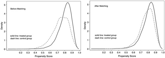 To ensure the reliability of the propensity score matching results, the balance test of covariates was also carried out, and results are reported in Appendix A. Specifically, after matching, the deviation of covariates between the treated group and the control group decreased to less than 1%; the LR statistics decreased from 1476.42 to 7.92, suggesting that there were no significant systematic differences between the treated group and the control group, which meets the balance hypothesis. The results of common support in Figure 3 show that after the correction of propensity score matching, the distribution of the propensity score of the treated group and the control group tended to coincide, which meets the common support hypothesis.