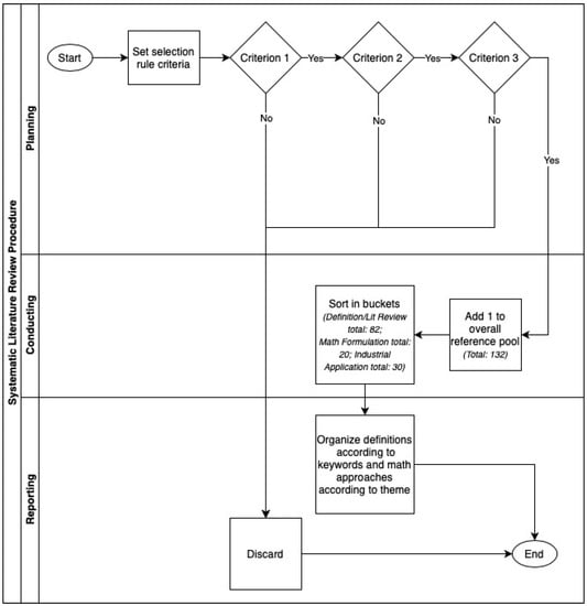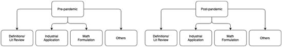 The reference sorting was conducted through categorical sorting, setting two classifications in function of the COVID-19 pandemic, three main subclasses, and a selection rule. If the reference was published before the pandemic, it was sorted into the pre-pandemic category, or bucket; otherwise, it was deposited into the post-pandemic bucket (i.e., every publication between 2020 and 2022). It was assumed theories would change once the pandemic factor was included across the board. Within each bucket, three more classifications were fashioned: definition or literature review, math formulation, and industrial application. Only one bucket was left for miscellaneous current projects that contribute to the general research aims: others. The bucket classification model allowed for effective reference management and revision. As a review policy, each bucket had a maximum capacity of 60 references and a minimum of 5.