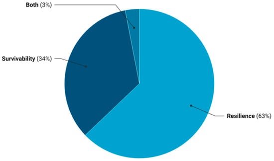 The number of references included in the compendium of definitions and quantification techniques equals 132. The largest number of publications ranges from 2020 to 2022—the estimated duration of the pandemic—while the shortest concentration illustrates the insights from the past century, specifically the late nineties. Most of the references gathered demonstrate the wide exploration dedicated to resilience as a topic of general interest over the last twenty-five years, but only 3% managed to insert survivability into their studies. Even lower is the percentage of publications comparing the two subjects in a single study since 2010.