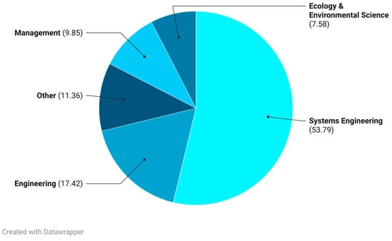 Consider the pie graph for theme distribution (Figure 3), as it projects the proportions of references discussing both resilience and survivability in a single study and those covering only the survivability tract. It demonstrates that publications involving resilience and survivability in a single study scarcely reach a reasonable percentage. Furthermore, according to Figure 4, 53.79% of the references gathered have shown the pertinence of either resilience, survivability or both theories in the systems branch, which converges several sectors of the industry uncovering new strategies for disruption. The systems branch involves the advancements made in fields where a collection of units interdepends on one another to achieve a common purpose. The feature of interdependence is faithfully tied to the systems engineering mindset. Then, 19% of the references certify the overall effectiveness of the theories in natural and human sciences, reuniting views from economists, ecologists, environmentalists, physicians, and psychologists from different colleges of the US and other countries. Figure 3 and Figure 4 superpose on each other in the sense that most engineering and systems engineering articles focus on resilience.