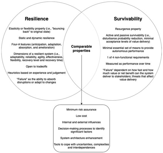 The first two comparable properties listed in Figure 7 point out that both resilience and survivability seek to lower costs and risks at a regional or global level. Both concepts have been described—especially resilience—as something the system does for the better, rather than something the system possesses [,]. Researchers have recently been examining where common ground may exist between domains to claim a definition that attaches diverse components into an intercommunicating system []. Every component may face unexpected events in times of uncertainty, which stirs the urgency to strategize and operationalize each component against internal and external shocks. In addition, engineers have notoriously been working on safety and quality in delivering service through high levels of adaptive capacity and risk tolerance [].