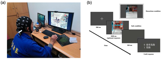 The procedural details of each trial are shown in Figure 1b. Each trial began with a fixation cross that appeared for 500 ms. Thereafter, an image depicting a construction scene was presented for a maximum of 3000 ms, followed by a blank screen for 500 ms. Subsequently, a response screen was shown, during which the participant was required to report his judgment of the construction scene seen before by pressing the corresponding key on the keyboard (“0” for safe and “1” for hazardous). No time limit was set for the response screen. On average, the official experimental session lasted approximately 14 min.