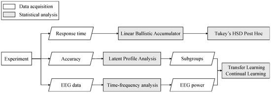 Previously, without real-time physiological measures, this idea of performance-driven adaptive automation was impossible in practice in the absence of overt behavioral output and ground truth during hazard inspection. In recent years, several studies have explored the possibility of using EEG to predict future cognitive performance [64,65]. This leads to the hypothesis that an EEG-enabled BCI can be established to predict construction hazard recognition performance. However, there is no direct evidence of whether EEG signals from individuals with high, medium, or low hazard recognition performance levels can be differentiated with classification accuracy exceeding the chance level. Therefore, further research is necessary to investigate the potential feasibility of applying such an EEG-based BCI to furnish a performance-driven adaptive aiding system for hazard inspections.