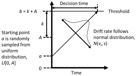 To gain deeper insight into the cognitive mechanisms of recognizing various hazards, computational modeling of response time (RT), which allows the decomposition of RT into several different psychological functions involved in the hazard recognition process, could be conducted. Previous studies have applied the accumulated model to various cognitive processes [82,83]. Although previous studies have typically indexed cognitive differences by mean differences in RT between various hazard types, RT contains a richer amount of information reflecting, for example, information-processing efficiency and response conservativeness. To dissociate a single RT into different subprocesses involved in hazard recognition response decisions, we utilized a linear ballistic accumulator model (LBA) [84]. In LBA, response time is considered the time participants take to accumulate evidence of hazardousness toward a decision threshold for characterizing the scene as hazardous or safe. The hazard recognition process is described using four parameters [85]: drift rate (v), representing the speed of evidence accumulation, that is, efficiency in information processing; the upper limit of the starting point distribution (A), representing the upper limit of the amount of existing evidence at the start of evidence accumulation (which varies across trials); threshold (b), representing the amount of evidence above which a “hazardous” decision is made; and non-decision time (psi), representing the time taken to encode stimuli and execute a response. With these parameters, the decision time is defined as the distance between the starting point and threshold divided by the drift rate (see Figure 3), whereas RT is composed of the decision and non-decision times (psi).