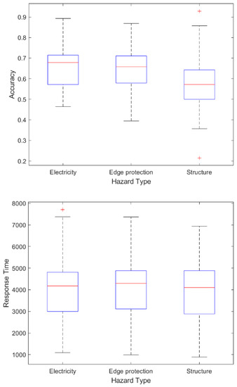 Figure 4 shows the mean accuracy and RTs for the two conditions for each hazard type. Differences across different types of hazards were checked using an analysis of variance (ANOVA) test. The results revealed that the accuracies of electricity and edge protection-related hazards were significantly higher than those of structural hazards (66.05% ± 9.87% for electricity, 64.36% ± 8.92% for edge protection, and 58.53% ± 12.18% for structures; F = 10.04, p < 0.001). There was no significant difference in RTs across the three hazard types (F = 0.12, p = 0.88).