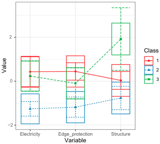 The LPA analysis separated the participants into three performance-level subgroups. These were named “high”, “medium”, and “low”, with the first subgroup having the highest probability of accurately recognizing all hazards and the last having the lowest probability of accurately performing the tasks (see Figure 7).
