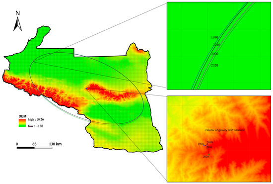 During the study period, the standard deviation ellipse of the ecological resilience of the UANST showed a northwest–southeast pattern. By analyzing the change in the azimuth angle, this study found that from 1990 to 2010, the azimuth angle decreased from 112.14 to 112.09 and then increased to 112.10. Additionally, from 2010 to 2020, the azimuth angle increased from 112.10 to 112.48, indicating that the ecological resilience of the UANST shifted clockwise and was more obvious from 2010 to 2020. From 1990 to 2020, the trajectory of the center of gravity of the ecological resilience of the UANST showed a trend in which the center of gravity moved southward overall. In 2000, the center of gravity moved to the southeast relative to its position in 1990, migrating at a distance of 0.64 km. The center of gravity moved 0.48 km to the northeast between 2000 and 2010. In the 2010–2020 period, the center of gravity continued to migrate to the southeast, and the migration distance increased to 2.85 km. From 1990 to 2020, the macroaxis standard deviation of the ellipse of the standard deviation revealed a minor growth tendency. In addition, the macroaxis standard deviation fluctuated and increased from 262.81 km to 263.45 km during the study period, indicating that the ecological resilience of the UANST expanded slightly in the northwest–southeast direction during the study period. In the brachyaxis direction, the standard deviation of the brachyaxis increased more, from 128.92 km to 131.18 km during the study period. This finding indicates that the ecological resilience of the UANST obviously expanded in the northeast–southwest direction during this period.
