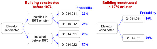 Generally, the elevator type has two options: hydraulic and traction elevators. The US Federal Emergency Management Agency (FEMA) [21] defined four possible candidates for elevators using the year 1976 as the separator. Each candidate was assigned a Fragility ID, namely D1014.011, D1014.012, D1014.021, or D1014.022, representing traction elevators installed in 1976 and after, traction elevators installed pre-1976, hydraulic elevators installed in 1976 and after, and hydraulic elevators installed pre-1976, respectively. If the elevator type and installation year are unavailable, the method shown in Figure 3 is used to randomly select the elevator type based on the building inventory data for each realization. Specifically, for buildings constructed before 1976, four elevator types are possible, with each presenting a probability of 25%. For buildings constructed in 1976 or later, only two types of elevators are possible, namely D1014.011 and D1014.021, with each presenting a probability of 50%.