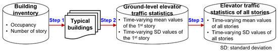 As stated in Section 1, elevator traffic exhibits complex spatiotemporal characteristics. As a result, it is impractical to accurately obtain the spatiotemporal data of elevator traffic for each building in an urban area given huge labor and time costs. To address this problem, a practical method for estimating the spatiotemporal distribution feature of elevator traffic for a building complex is proposed, as shown in Figure 4. In the absence of detailed field investigation data of elevator traffic for each story of a building, the proposed estimation method assumes that the statistical values of elevator passengers at different stories exhibit a linear relationship. In realistic situations, the specific occupancy of each story affects the elevator traffic level at that story, rendering the relationship between the NEP and the story extremely complex. However, obtaining these data at a city scale is difficult. The proposed method provides a feasible strategy for the city-scale estimation of NEP in building complexes. It consists of three steps: