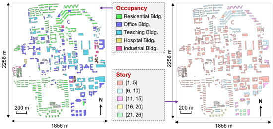 A real-world urban area, namely the Tsinghua University campus, was selected as the case study to demonstrate the feasibility of the proposed method. The campus, located in northwestern Beijing, China, features an area of approximately 4 km2. The seismic fortification intensity at this site is eight [20]. A field investigation was conducted to obtain the building inventory data of 619 buildings. The occupancy type and number of stories of the buildings are shown in Figure 6. The campus is dominated by residential and office buildings, with high-rise buildings mainly located in the northeast and southeast regions.