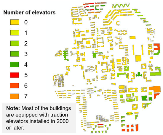 Elevator inventory data include the number of elevators in each building, the elevator type, and the installation year. At the building scale, these data can be obtained via field investigation or as-built drawings with acceptable labor and time costs. In contrast, it is difficult to obtain city-scale elevator inventory data given that a real urban area consists of a significant number of buildings with various conditions. In general, among elevator inventory data, the number of elevators at the city scale is easier to obtain than the elevator type and installation year. Therefore, the following estimation method is suggested if the elevator type and installation year cannot be obtained via field investigation or relevant drawings.