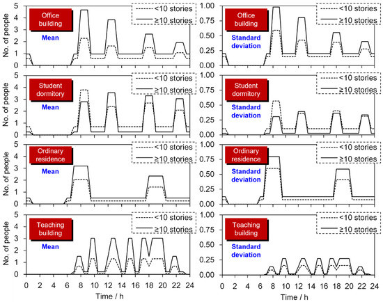 It can be seen from Figure 8 that there are significant differences in the peak periods of elevator traffic for buildings with different occupancies. The peak periods for office buildings and student dormitories are similar in that there are four peak periods, i.e., morning, midday, evening, and late-night peaks. For office buildings, the morning peak is the highest while the late-night peak is the lowest. Moreover, because employees working in low-rise buildings prefer to use stairs instead of waiting for an elevator, the elevator passengers of H buildings are significantly more than those of L buildings. For student dormitories, the L buildings exhibit the highest elevator traffic level at the morning peak, whereas the H buildings exhibit the highest elevator traffic level at the midday peak, which is attributable to the fact that the L and H buildings house primarily undergraduate and postgraduate students, respectively. Compared with undergraduate students, postgraduate students are less constrained by courses; consequently, their schedules are more flexible, which results in greater uncertainties in their work and rest patterns. An interesting finding is that the postgraduate students were more likely to leave and return to their dormitories later in the day, as reflected by the fact that the midday, evening, and late-night peaks in H buildings are higher than the morning peak. The ordinary residences have morning and evening peaks. Owing to the university’s class schedule, the teaching buildings have multiple peaks. Apart from the dormitories, the peaks of the H buildings generally exceed those of the L buildings. Moreover, the peak-time standard deviations of the office and ordinary residences are greater than those of the dormitories and teaching buildings. This is because, unlike staff, students are generally preoccupied with class attendance and research, which translates to a more structured and less random activity pattern.