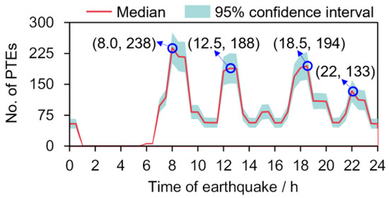 Figure 10 shows the number of PTEs on the campus when the earthquake occurs at different times on a weekday. The curve indicates four local peaks, which correspond to the time of earthquake (TOE) of 8:00, 12:30, 18:30, and 22:00, respectively. Considering that the PTE risk level is affected by multiple factors with significant uncertainties, Figure 10 presents the time-varying median values in conjunction with the 95% confidence intervals to provide government agencies with a sound reference. At the TOE of 8:00, the PTE number reached its maximum value, with a median of 238 and a 95% confidence interval from 201 to 276. The median values of the remaining three peaks are 188, 194, and 133, respectively. In addition, if the earthquake occurs at an off-peak time of elevator traffic, e.g., 16:30, the PTE number is approximately a quarter of the maximum value of 238.