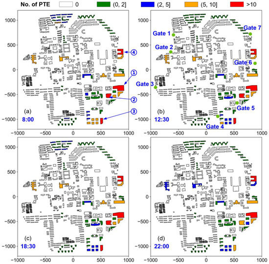 The PTE risk level of an urban area varies significantly by the TOE owing to the temporal nature of elevator traffic in building complexes. The number of PTEs is relatively large when an earthquake occurs at the peak period of elevator traffic. In the case study of the Tsinghua University campus, as shown in Figure 10 and Figure 13, the maximum number of PTEs is observed at the TOE of 8:00–9:00, followed by at the TOE of 17:30–18:30; the number of PTEs at the TOE of 12:00–13:00 is slightly lower than that at the TOE of 17:30–18:30; and the number of PTEs at the TOE of 22:00–23:00 is the smallest among the abovementioned four local peaks. When the earthquake occurs during the off-peak hours of elevator traffic (e.g., at 16:30), the number of PTEs is approximately a quarter of that at the TOE of 8:00.