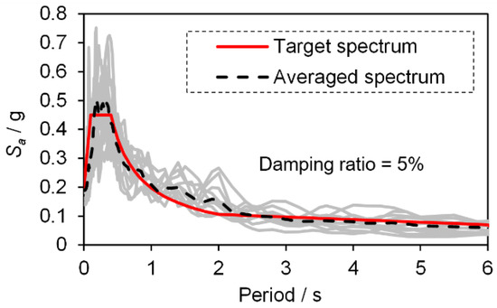 Intensity-based assessment requires a set of ground motion records that reflect the site characteristic of the target area. Generally, at least eleven ground motion records are needed [21]. Therefore, eleven ground motion records (Table A1 in Appendix A) that matched the target response spectrum of the campus were identified from the NGA-West2 database [24] established by the US Pacific Earthquake Engineering Research Center. A target response spectrum was generated according to the design basis earthquake level specified in the Chinese standard [20]. The response spectra of the selected records and the corresponding averaged spectrum are shown in Figure 12, demonstrating that the selected records can reflect the site features of the campus. Furthermore, four earthquake intensities with the PGA of 0.1 g, 0.2 g (DBE level), 0.3 g, and 0.4 g (maximum considered earthquake (MCE) level) were considered to evaluate the PTE risk of the campus. For each intensity, the average of the simulated results under the eleven ground motions was identified as the final assessment result.