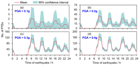Number of PTEs on the Tsinghua University campus under earthquakes with different intensities (earthquakes occur on weekdays): (a) PGA = 0.1 g, (b) PGA = 0.2 g, (c) PGA = 0.3 g, and (d) PGA = 0.4 g.
