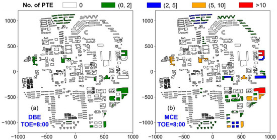 Number of PTEs in buildings when (a) DBE- and (b) MCE-level earthquakes occur at 8:00 on a weekday.