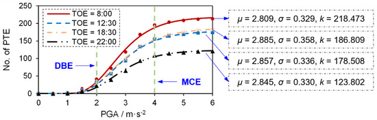 Furthermore, based on the simulations with the selected ground motions being adjusted to other PGA levels (e.g., 0.25 g and 0.35 g), the fragility curve of PTE risk on the campus could be obtained by fitting the relationship between the earthquake intensity and the number of PTEs. In this section, a total of 132 scenarios (i.e., 11 ground motions with 12 intensity levels) were simulated to generate fragility curves. The CDF of the lognormal distribution is widely used to fit fragility curves in the field of earthquake engineering [21]. Hence, it was also used in this study. As shown in Equation (12), the fitting function features three parameters, i.e., μ, σ, and k. Figure 15 indicates the fitted fragility curves for the TOEs of 8:00, 12:30, 18:30, and 22:00, provided that the earthquake occurs on weekdays. For brevity, the fragility curves for other TOEs are not presented. At the TOEs of 8:00, 12:30, 18:30, and 22:00, the limit values of PTEs are 218, 179, 187, and 124, respectively. Furthermore, the maximum number of PTEs under the MCE is approximately five times that under the DBE.