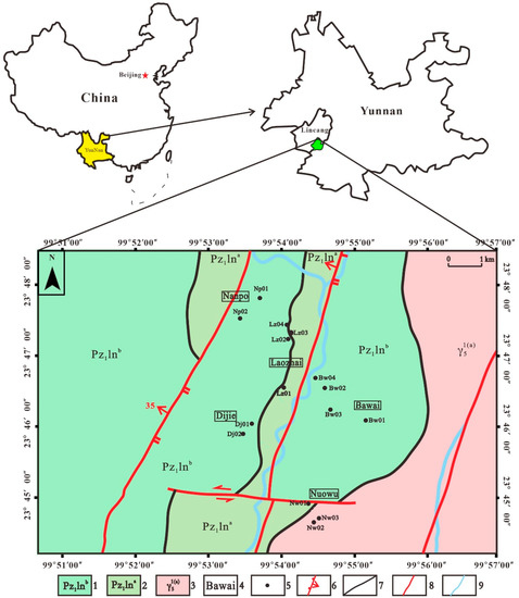Geological map of tea garden distribution area. 1—Lancang group B; 2—Lancang group A; 3—granite marginal facies; 4—tea garden name; 5—sampling point; 6—measured reverse fault; 7—measured geological boundary; 8—inferred unknown fault; 9—river.