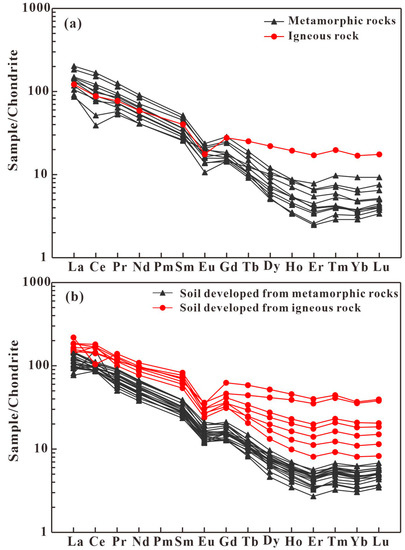 Chondrite-normalized REE distribution patterns of rock (a) and soil (b) samples.
