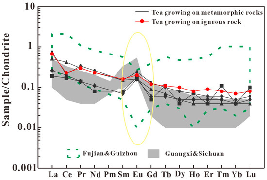 Chondrite-normalized REE distribution patterns of tea samples, with differences in Eu content between various samples shown within the yellow elliptical line. (Data for green dashed line from Fujian and Guizhou [10,48]; data for gray area from Guangxi and Sichuan [49,50]; data for lines from this study).