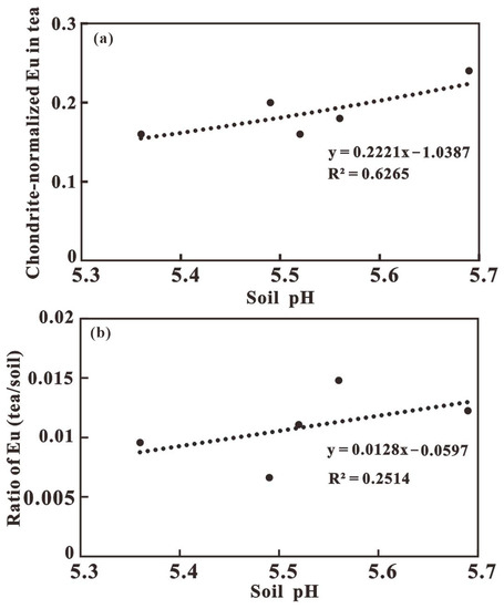 The distribution patterns of chondrite-normalized REEs in tea samples from the study area and previous studies are shown in Figure 3 [10,48,49,50]. The distribution curves of REEs in tea were the same as those in rock and soil. Eu showed significantly positive anomalies in tea samples, in opposition to those in soil and rock samples. According to previous studies, divalent Eu could have a significantly different geochemical behavior from other REEs [51,52]. Positive Eu anomalies in plants were usually explained as the result of the reduction of Eu3+ to Eu2+ in a reducing environment and preferential uptake of Eu2+ through the roots of plants [53].