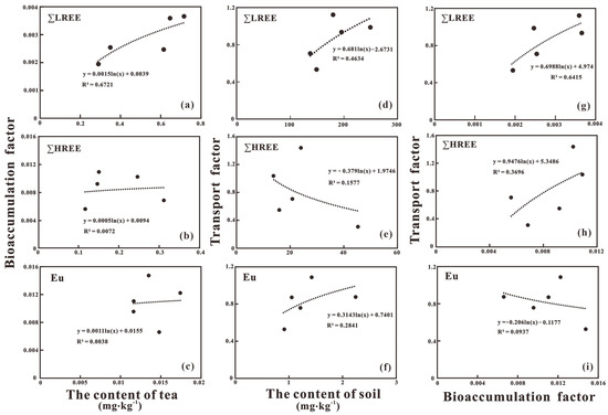 The characteristics of REEs in tea are closely related to those of the soil. Previous studies have shown that REEs are obtained from soil by tea through absorption and accumulation [9]. The chondrite-normalized distribution pattern of REEs in Tie Guan Yin tea was similar to that of REEs in the soil [10]. Approximately 2.23% of REEs were transferred from the soil to tea in the study of an organic tea garden in Guangdong [11]. The uptake of REEs by tea is mainly related to the concentration and/or speciation forms in soil [12]. While the physical and chemical properties of soil are determined by the parent material [13], there is a certain degree of correlation between the elemental contents of rock, soil, and plants [14]. REEs are always enriched in plants growing in areas with high REE levels in bedrock [15]. The elements in tea have a significantly positive correlation with those in rock and soil [16].