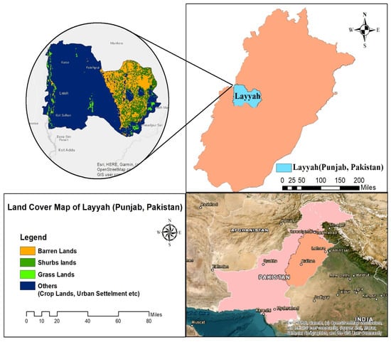 The present study was conducted in rangelands of Thal desert situated in district Layyah (Figure 1). It is located between 31°10′ N and 71°30′ E in southern Punjab, Pakistan. A subtropical sandy desert that is bounded by Indus River at its west while in north is Jhelum and Chenab river flood plains lies on its east [36]. Thal desert is the third largest desert in the country, occupying 2.5 million hectares. It is characterized by semi-arid to hyper-arid climatic conditions, having rainfall less than 200 mm. Most of this rainfall occurs in the monsoon season between the middle of June and late August (450–800 mm). These regions are often quite hot, experiencing temperatures that rise until 46 °C in the summer while in the winters, they can fall to 1 °C in the nights.