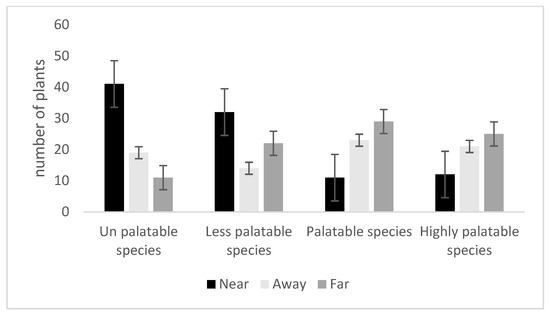 Our results are in line with Hendricks et al. [48], which implicates that, with an increasing appearance of pastoralist populations, pressure on the grazing resource usually intensifies near the vicinity of the settlements. It has led to a shrinkage of palatable species, thus replaced with inedible and toxic species. A few studies in similar conditions have associated an increasing cover and density of unpalatable species to be an initial indicator of land degradation [49,50].
