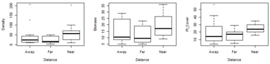 Box plots depicting differences in vegetation cover, density and biomass along the settlement gradient.