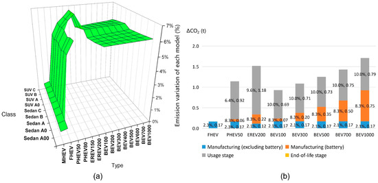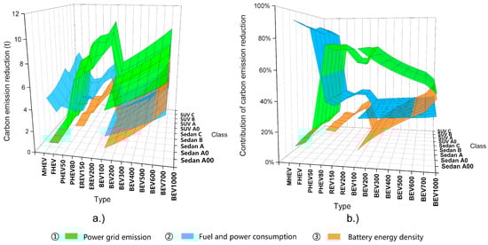 Similar to Figure 1b, the stacked bars in Figure 2b show the amount of carbon emission reduction (ΔCO2) in different stages after the power consumption is improved by 10%, and the percentages marked on the bars refer to the carbon emission reduction rate of the stage after the power consumption is improved by 10%, compared to the carbon emission of the same stage in 2030. These results can be used to quantify the effect of the grid emission when further reduced. The representative A-class SUVs are selected.