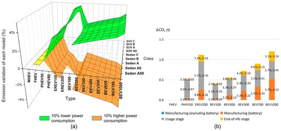 The influence of power consumption on each type of vehicle. (a) Sensitivity analysis of power consumption. (b) The emission distribution of different sources (A-class SUV). The numbers are emission reduction amount according to ΔCO2 (t) and the percentage is the rate of emission in the corresponding stage (reduced carbon emissions/original carbon emissions).