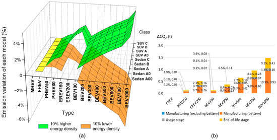 The influence of battery power density on each type of vehicle. (a) Sensitivity analysis of battery energy density. (b) The emission distribution of different sources (A-class SUV). The numbers are emission reduction amount according to ΔCO2 (t) and the percentage is the rate of emission in the corresponding stage (reduced carbon emissions/original carbon emissions).