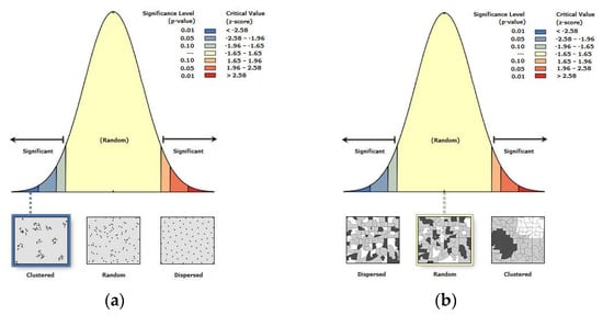 According to Tobler’s first law of geography [35], spatial autocorrelation is a spatial statistical method whose global and local spatial autocorrelation can better describe the relationship between geographic things and measure the degree of aggregation or dispersion among the attributes of spatial elements [36]. Moran’s I index was used in this study to examine the relationship between the spatial distribution of PCF and their own level and service capacity in Tianjin’s central area.