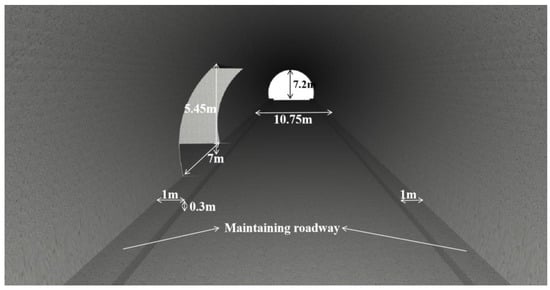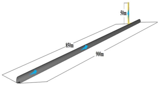 The length of the tunnel model is 900 m. Due to the limitation of the simulation efficiency of the FDS software, it takes an extremely long time to simulate the complete section of the tunnel model. The fire scenario envisioned in this paper is a vehicle blockage in the tunnel that causes a fire, and the smoke characteristics along the evacuation path of people are mainly analyzed, so a 900 m long tunnel model is sufficient. The overall dimensions of the tunnel model are shown in Figure 2, and the detailed dimensions are shown in Figure 3. The cross-section of the tunnel model is a three-centered arch with a net height of 7.2 m and a net width of 10.75 m. Passages with a width of 1 m and a height of 0.3 m are set on both sides of the tunnel. The exhaust shaft is set at a distance of 850 m from the initial end of the tunnel with a height of 50 m. It is connected to the tunnel through a liaison shaft. The cross-sectional areas of the exhaust shaft and the liaison shaft were 38 m2 and 34 m2, respectively. The surface properties of the model were set to be layered. The inner wall is concrete with a thickness of 0.25 m. The concrete density is set to 2300 kg/m3, the thermal conductivity is set to a factor of 1.2 W/(m·K), and the specific volume is set to 1100 J/(kg·K). The rest is the rock layer. The initial end of the tunnel model is set as the air inlet, the end is set as the opening, the top of the exhaust shaft is set as the exhaust port, and the wind flow direction is the blue arrow in Figure 3. The initial temperature inside the model is 20 °C. To analyze the smoke characteristics along the evacuation path of the personnel, temperature, visibility, and CO concentration slices were set up at the height of the personnel (2 m above ground level). Smoke concentration slices were set at the mid-axis of the tunnel and 200 m downstream of the fire source to observe whether the smoke flow reversed back and the distribution of the smoke flow in the cross-section.
