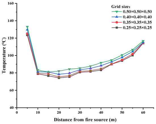 According to the FDS guidebook recommendations [25], the simulation results are more accurate when the grid size is 0.1 D*, so a fire size of 30 MW is brought into the formula calculation, and the resulting grid size is 0.37 m. For best accuracy, the cell dimensions should ideally be close in length in all three directions. Therefore, in order to compare the effects of different grid sizes on simulation accuracy, four cubic grids of 0.25 m, 0.35 m, 0.40 m, and 0.50 m were selected for grid independence tests under a 30 MW fire source to compare their temperature differences. Figure 4 shows the temperature variation at a 2 m height under different grids. In the figure, it can be seen that the temperature at a 2 m height gradually increases with the increase in grid size, but the overall variation is not very different and the temperature variation curve can converge. Considering the accuracy and efficiency of the simulation, the encrypted area is between the fire source location and 200 m downstream and a 0.25 m cubic grid is used, while a 0.5 m cubic grid is used for the other areas. There are 17,788,416 grids in the whole tunnel model.
