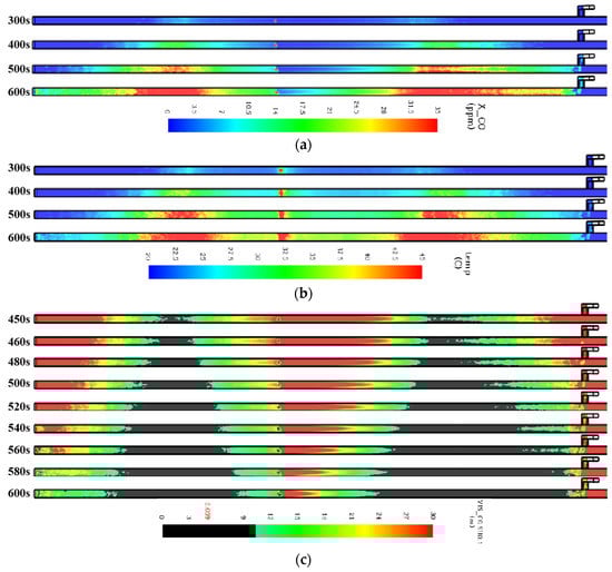Change in smoke characteristics in scenario A1. (a) CO concentration; (b) temperature; (c) visibility.