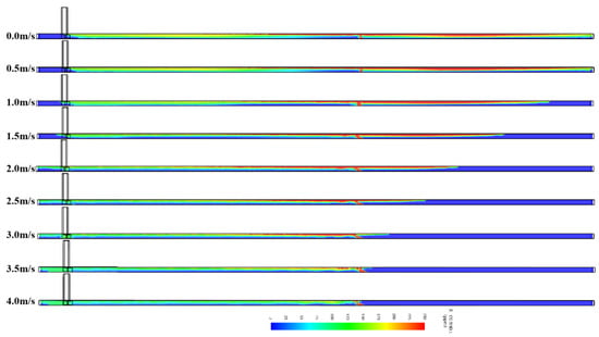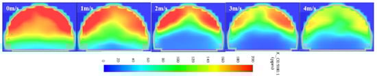 When the wind speed reaches 2 m/s, there is no hazardous area upstream of the fire source compared to when the wind speed reaches the critical wind speed. Figure 7 shows the side view of the tunnel smoke concentration at different wind speeds. As can be seen in the figure, when the wind speed is 2 m/s, the smoke layer remains at a certain height and does not drop to the height of the personnel, although the smoke flow upstream of the fire source reverses a distance of 150 m. Visibility is always above the safety threshold. With the increase in wind speed, the distance of smoke reverse retreat gradually decreases. At the same time, the increase in longitudinal wind speed leads to faster smoke flow movement and smoke flow overflowing out of the exhaust shaft. When the wind speed is greater than or equal to 2 m/s, the flue gas will overflow the shaft.