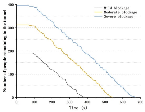 Figure 10 shows the change in the number of people in the tunnel with time for different evacuation numbers. tmove is 380 s, 510 s, and 650 s for scenarios R1, R2, and R3, respectively. A hundred seconds after the fire broke out, the crowd began to leave the tunnel. The change curves of the number of people in the three evacuation scenarios are basically parallel, which indicates that the average evacuation speed of the crowd is basically the same, and the total evacuation time is positively correlated with the number of people.
