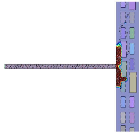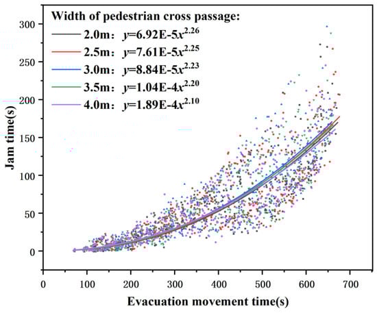 During the evacuation process, bottleneck effects occur at key areas, such as stairway entrances and access exits. As shown in Figure 11, a group of people crowded at a bottleneck will accumulate and stay at the “bottleneck” for a long time, which will lead to a serious decrease in evacuation efficiency and increase the evacuation movement time of people. To study the effect of pedestrian crossing width on evacuation efficiency, a scatter plot for each person is plotted with evacuation movement time as the horizontal coordinate and blockage time as the vertical coordinate. The expression of blockage time was fitted according to the scatter plot, and the results are shown in Figure 12.