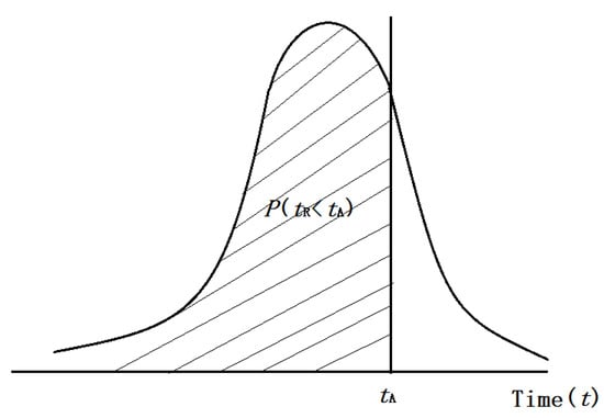 where P is the probability. The tA under different fire scenarios can be obtained in Table 5. tR is affected by random factors such as escape distance, building facilities, and personnel response time, and is a random variable which belongs to the probability distribution curve. Set f(tR) as the probability density function of tR, as shown in Figure 13. The probability that tR is less than tA is R.