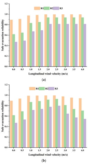 Figure 14 shows the calculation results of safety evacuation reliability under different longitudinal wind speeds. It can be seen in the figure that the safety evacuation reliability of the R1 scenario is significantly higher than that of the other two scenarios due to the small number of evacuees. The safety evacuation reliability upstream of the fire source increases with the increase in the longitudinal wind speed, and the reliability of scenarios R2 and R3 increases significantly. When the wind speed reaches 2 m/s, the safety evacuation reliability remains unchanged, the safety evacuation reliability of R1 is close to 1, and the R2 and R3 scenarios are 0.93 and 0.82. The safety evacuation reliability downstream of the fire source first increases and then decreases with the increase in wind speed. When the longitudinal wind speed is 2.5 m/s, the safety evacuation reliability reaches the highest, and the safety evacuation reliability of the three evacuation scenarios are 0.99, 0.92, and 0.79, respectively. When the longitudinal wind speed increases to 4 m/s, the safety evacuation reliability downstream decreases to 0.94, 0.70, and 0.54, respectively. Whether upstream or downstream of the fire source, the increase in evacuation numbers will reduce the reliability of a safe evacuation. A longitudinal wind speed of 2.5 m/s is the most favorable for personnel evacuation. Excessive longitudinal wind speed reduces the safety evacuation reliability downstream of the fire source, especially when there are many evacuees; the evacuation reliability is only 0.5.