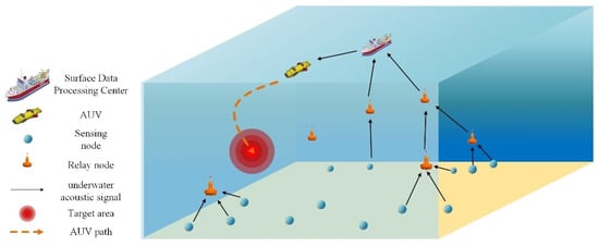 In future work, the cooperative data transmission problem among multiple AUVs will be further investigated. First, the issue of path planning for multiple AUVs should be investigated. In this paper, we study the target area search and assume that AUVs can arrive in a straight line as soon as possible, while in practical applications, the movement of AUVs is affected by environmental factors such as obstacles, thus reducing the efficiency of the data collection. Second, a more intelligent allocation algorithm that combines the factors of energy, location, and communication resources to assign tasks to different AUVs in a more reasonable and efficient way is required. Last but not least, the safety issue in data collection has been neglected. Nodes are generally considered to be reliable and trustworthy. However, in practice, the network is vulnerable to malicious attacks due to its openness and unattended nature. It is important to identify the reliability of nodes and motivate them to actively participate in collaborative data forwarding.